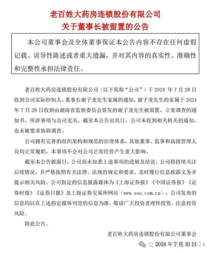 7月30日晚,老百姓大药房连锁股份有限公司发布公告表示,于7月28日收到公司实际控制人、董事长谢子龙家属的通知,谢子龙的家属于当日收到由湖南省监察委员会签发的谢子龙被留置、立案调查的通知书。