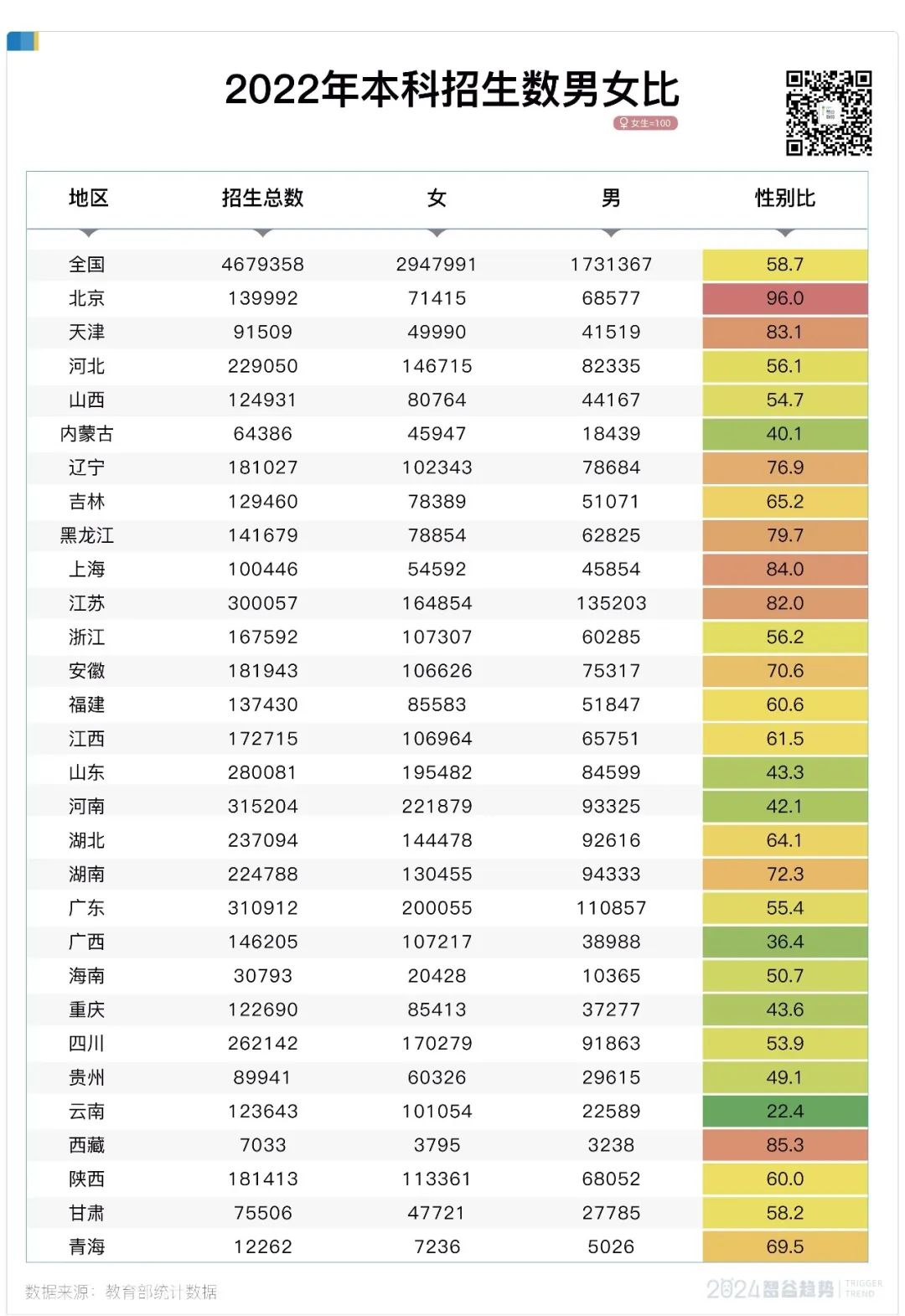 2022年,全国本科招生人数468万,其中女性295万,男性只有173万。这意味着,每100位女生拿到本科录取通知书,对应的只有58名男生!比例逼近惊人的2:1。