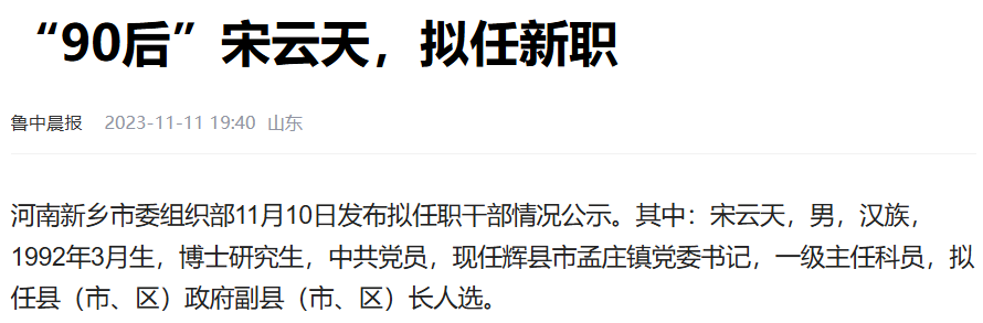 至于其飞升速度有多快,可以对比一下另一位大火的副处级干部宋云天。宋云天1992年出生,清华本硕博毕业,在乡镇摸爬滚打,直到31岁才被提拔为副处。