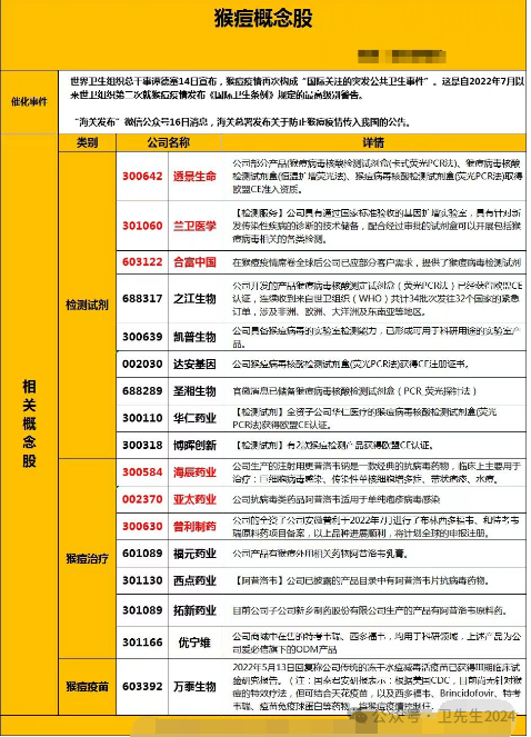 猴痘治疗药物开发商GeoVax Labs涨30%、SIGA涨26.94%;猴痘病毒检测产品制造商罗氏、雅培也同步上涨,应用DNA科学公司涨25.82%。