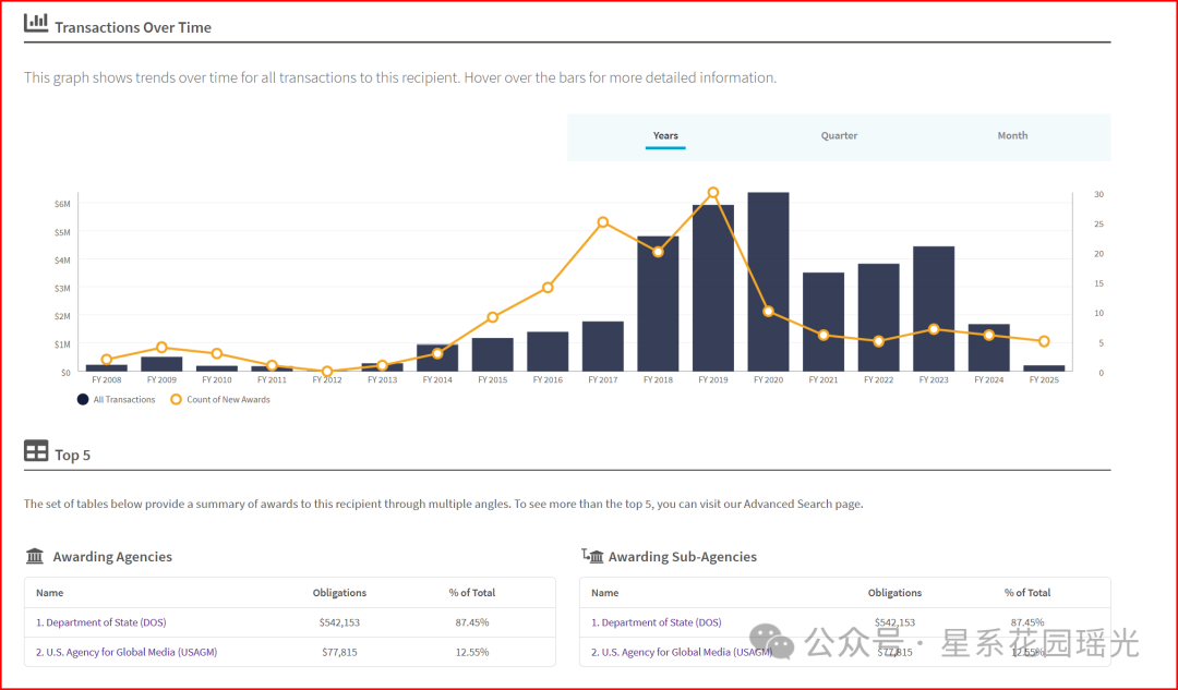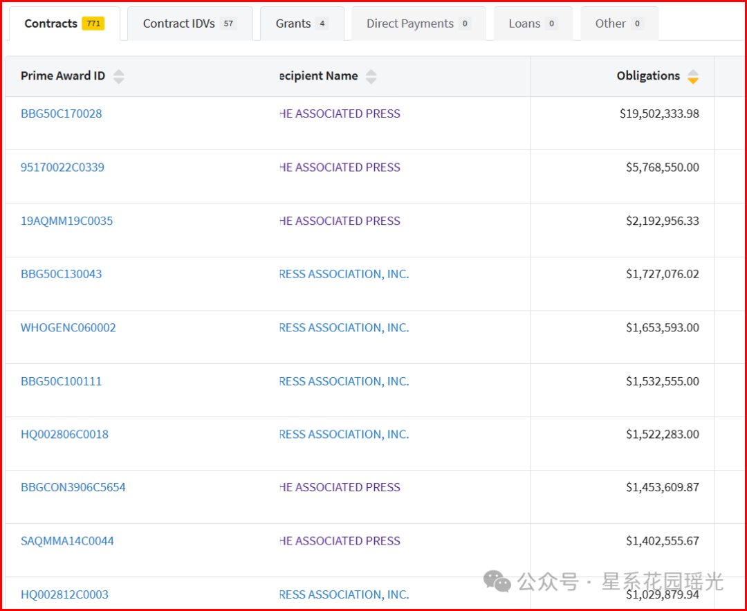 从明细账可以看出,疫情前几个月开始,美联社突然从布林肯所在部门拿到了一大笔钱,之后两年越来越多。但在2025年1月,经费被马斯克砍到几乎没有……