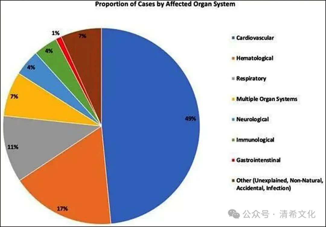 在深入分析这些病例后,我们发现受影响最为严重的器官系统当属心血管系统,占比高达49%,紧随其后的是血液系统,占比17%,呼吸系统则以11%的比例位列第三,而多器官系统受影响的病例也占到了7%的比例。